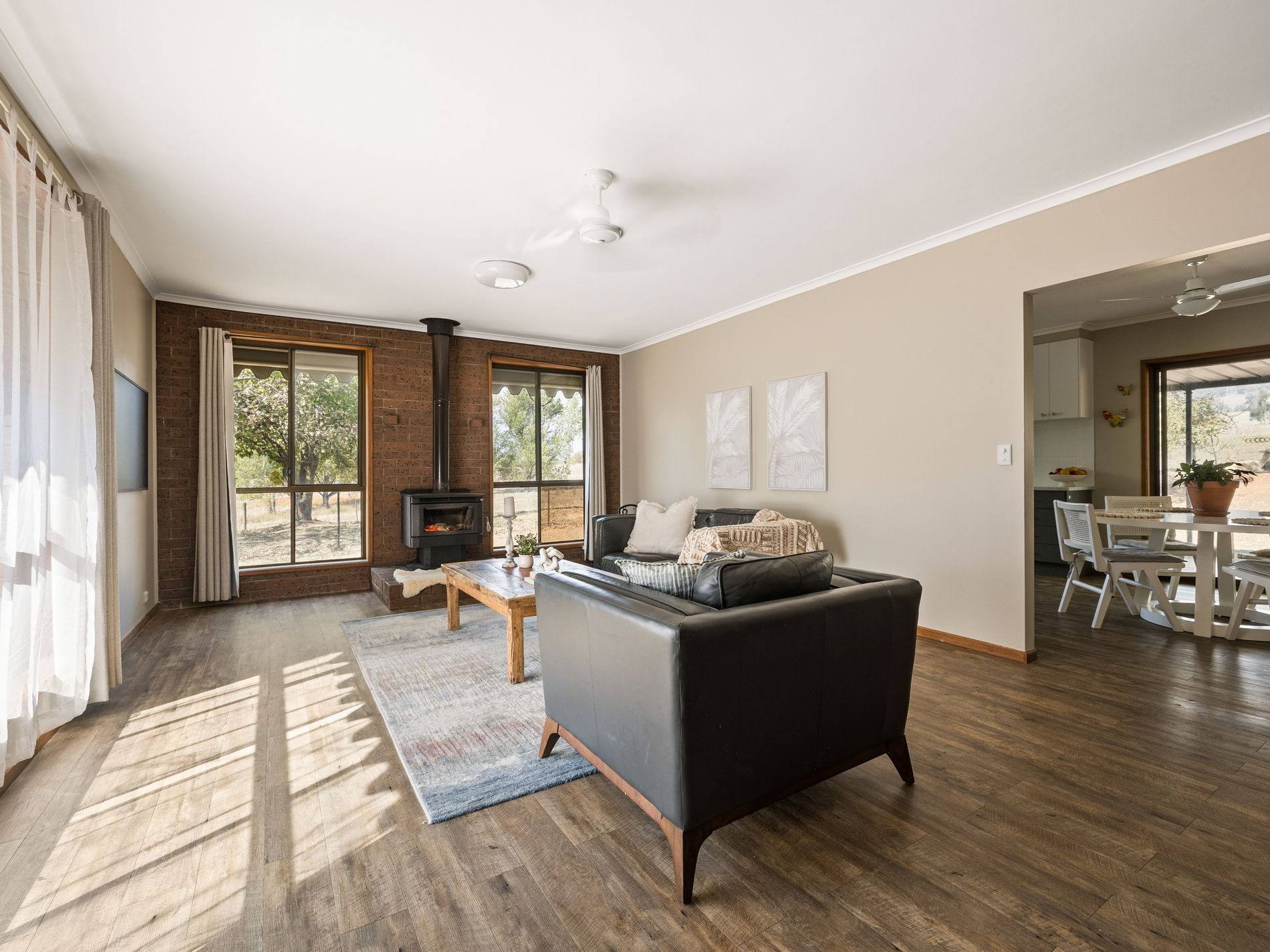 Living: Light-filled lounge with cosy wood heating and sweeping views across the front yard and adjoining farmland