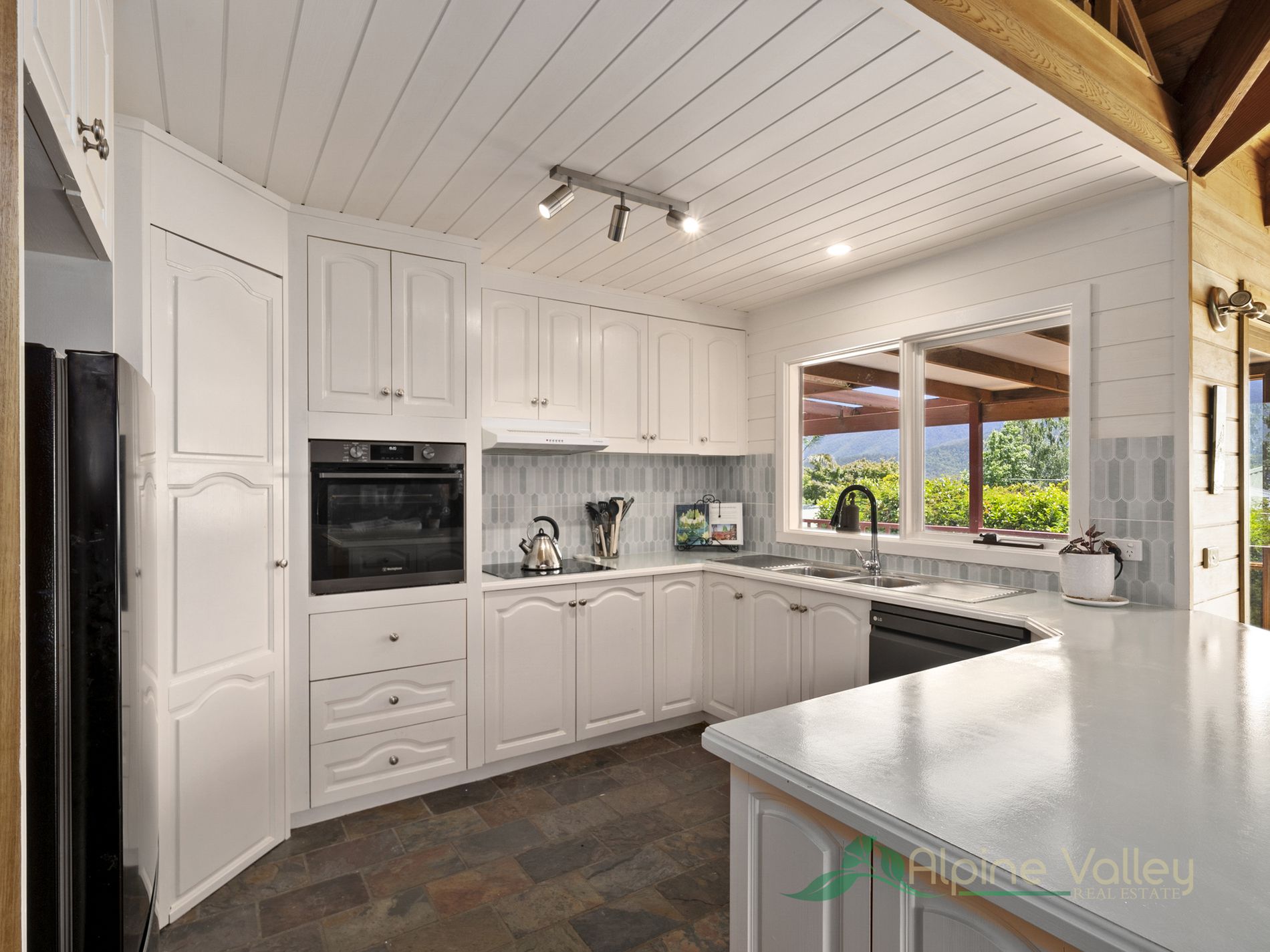 The spacious living area seamlessly connects to the dining, kitchen, and sitting spaces, providing plenty of room for family gatherings and entertaining. The kitchen is both functional and inviting, featuring slate flooring, a separate pantry, and electric cooking.