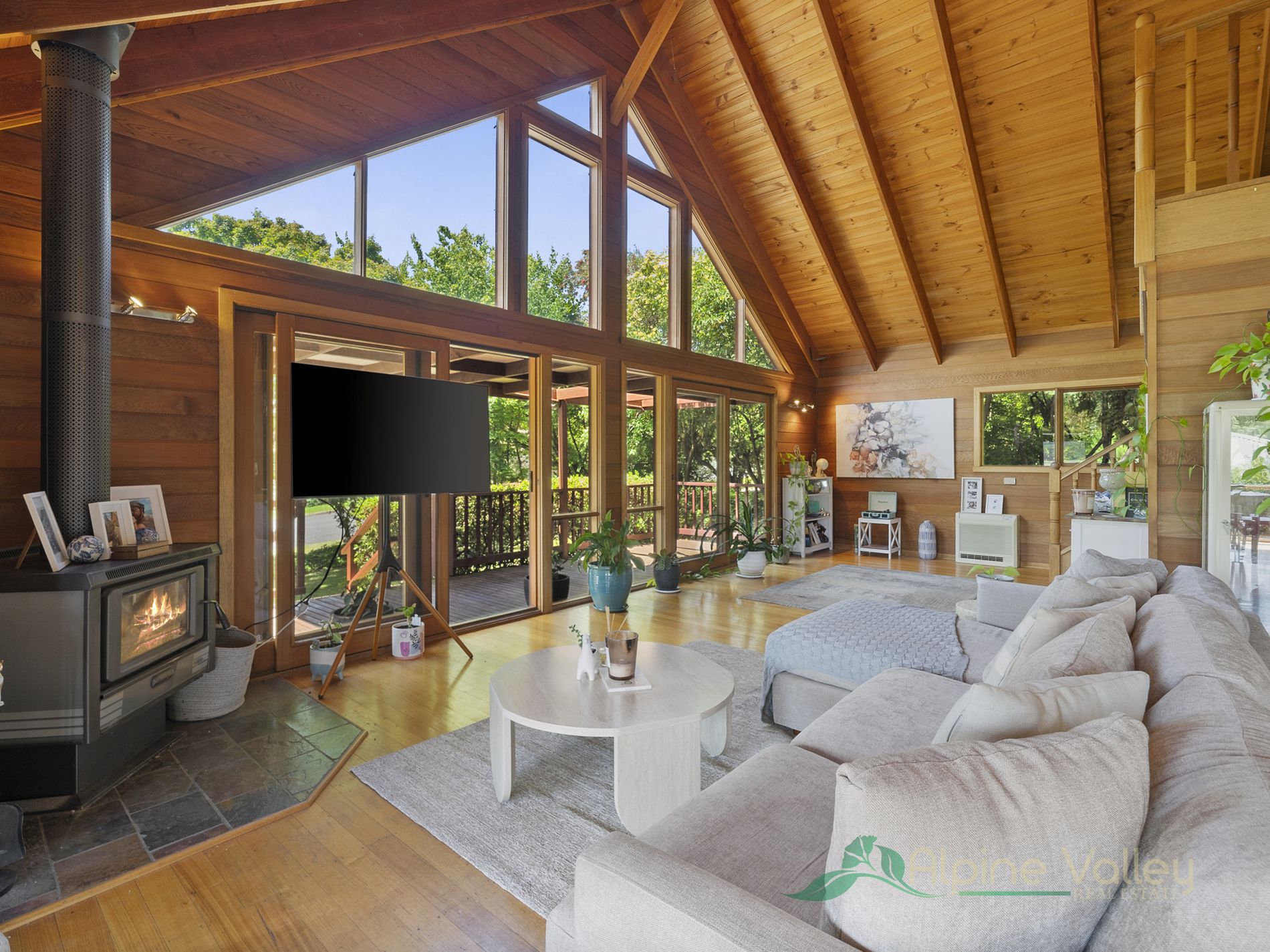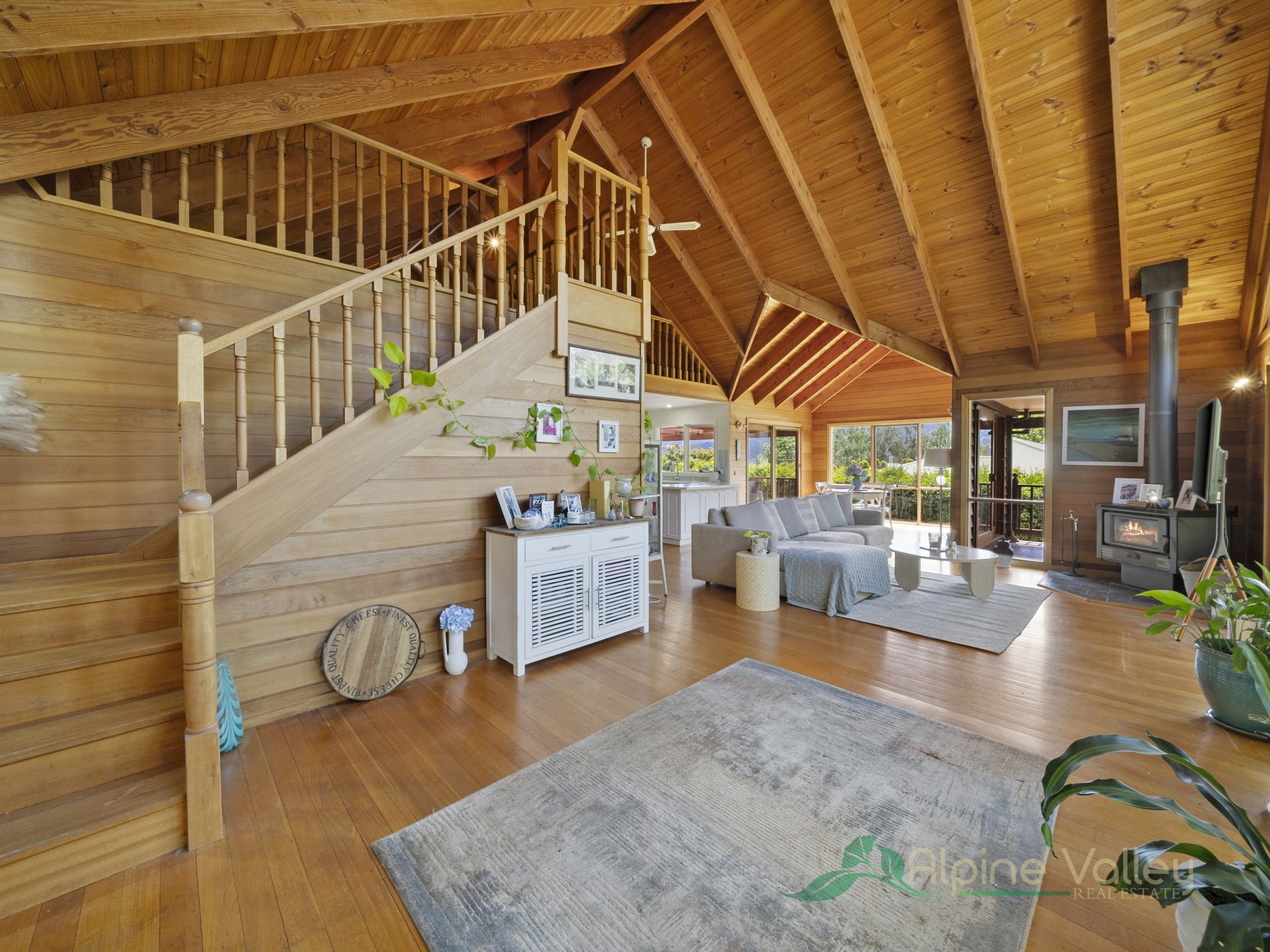 Step inside, and you’ll be greeted by an abundance of natural light pouring through large windows, complemented by a soaring cathedral ceiling in the living area. The elegant mountain ash flooring flows throughout most of the home, adding warmth and character to the space.