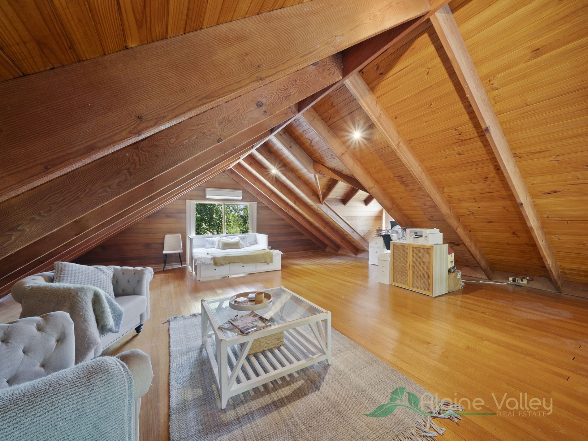 Ascend to the mezzanine floor, a significant space with beautiful mountain and valley views, ample natural light, and elegant mountain ash flooring. Currently utilized as a home office, this versatile area could easily transform into a master bedroom or a cozy second lounge.
